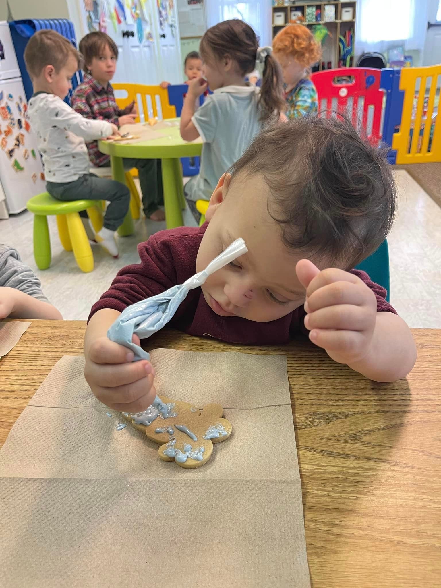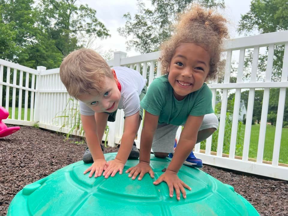 Outdoor play is incorporated into the daily schedule. Staff members actively engage in activities when prompted by the children. Outdoor play is an opportunity for children run, jump, climb and use their bodies in ways that would otherwise be unsafe in an indoor classroom. In addition, a large amount of social interaction takes place when children play outdoors. Because they are engaged in few teacher-directed activities and more child directed play, children are able to choose their friends and who to interact with.